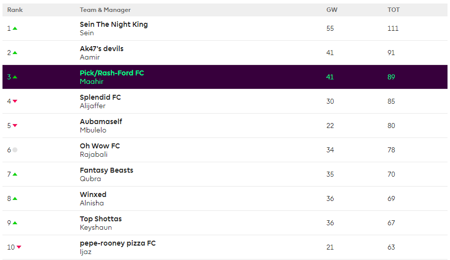 As seen above, Sein has rocketed to the top with 55 POINTS, WHAT EVEN?! Both Aamir and Maahir also posted good scores to keep themselves in the running, though Sein now has a distinct advantage. We had 2 big falls this week with last week’s leader Mbulelo falling all the way down to 5th, while previously 7th placed Ijaz currently occupies the bottom spot.